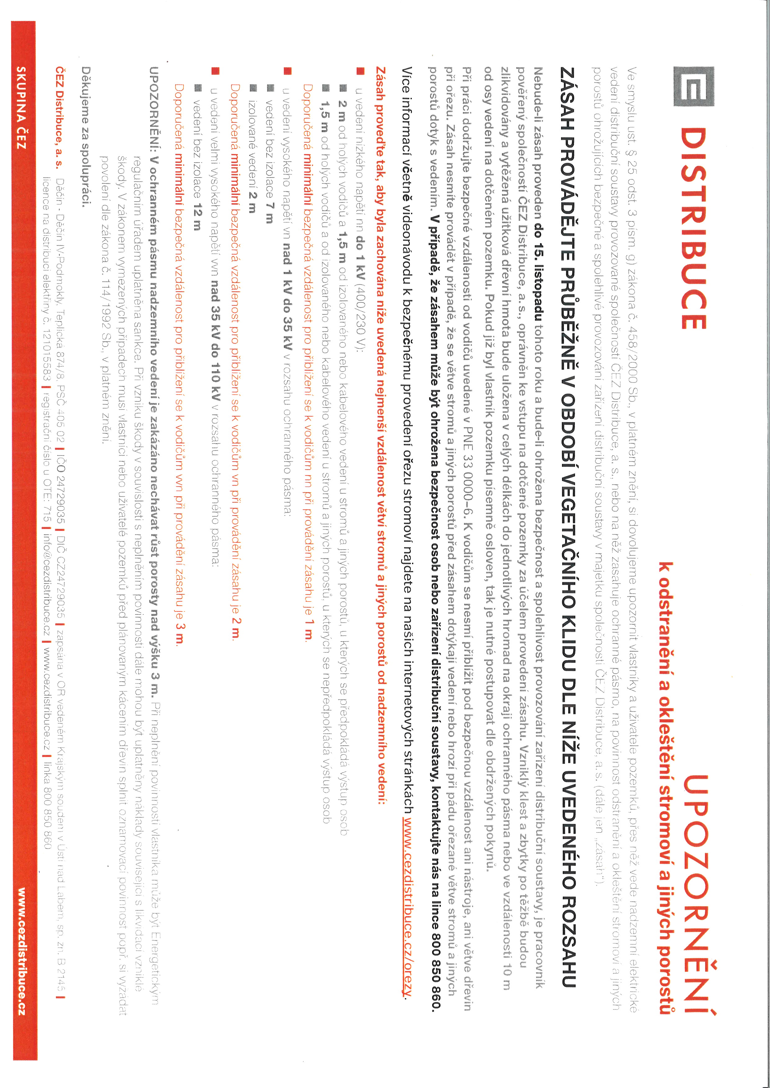 ČEZ Distribuce - UPOZORNĚNÍ k odstranění a okleštění stromoví a jiných porostů | 18.09.2019 | 22.11.2019 |